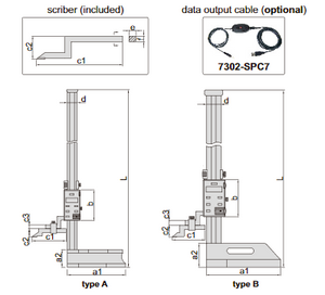 {"id":6017097236639,"title":"Digital Height Gages (Economic Type, Non-Waterproof)","handle":"digital-height-gages-economic-type-non-waterproof","description":"\u003ch3\u003e\u003cspan style=\"text-decoration: underline;\" data-mce-style=\"text-decoration: underline;\"\u003eDescription\u003c\/span\u003e\u003c\/h3\u003e\n\u003cul\u003e\n\u003cli\u003eResolution: 0.01mm\/0.0005\"\u003c\/li\u003e\n\u003cli\u003eButtons: on\/off, zero, mm\/inch, ABS\/INC, data hold, TOL, set\u003c\/li\u003e\n\u003cli\u003eABS\/NIC is for absolute and incremental measurement\u003c\/li\u003e\n\u003cli\u003eTOL is for tolerance measurement\u003c\/li\u003e\n\u003cli\u003eCarbide tipped scriber\u003c\/li\u003e\n\u003cli\u003eMade of stainless steel (except the base)\u003c\/li\u003e\n\u003cli\u003eLR44 battery, data output\u003c\/li\u003e\n\u003cli\u003eSupplied with the dial test indicator holder\u003c\/li\u003e\n\u003cli\u003eSupplied with dust cover (except 1150-1500\/2000)\u003c\/li\u003e\n\u003cli\u003eOptional accessory: data output cable\u003cbr\u003e(code 7302-SPC7, keyboard format)\u003c\/li\u003e\n\u003c\/ul\u003e\n\u003cp\u003eFor the following table the unit is mm unless otherwise specified.\u003c\/p\u003e\n\u003ctable width=\"100%\" data-mce-fragment=\"1\"\u003e\n\u003ctbody data-mce-fragment=\"1\"\u003e\n\u003ctr data-mce-fragment=\"1\"\u003e\n\u003ctd data-mce-fragment=\"1\"\u003e\u003cstrong\u003e Code\u003c\/strong\u003e\u003c\/td\u003e\n\u003ctd data-mce-fragment=\"1\"\u003e\u003cstrong\u003eRange\u003c\/strong\u003e\u003c\/td\u003e\n\u003ctd data-mce-fragment=\"1\"\u003e\u003cstrong\u003eType\u003c\/strong\u003e\u003c\/td\u003e\n\u003ctd data-mce-fragment=\"1\"\u003e\u003cstrong\u003eAccuracy\u003c\/strong\u003e\u003c\/td\u003e\n\u003ctd data-mce-fragment=\"1\"\u003e\u003cstrong\u003eL\u003c\/strong\u003e\u003c\/td\u003e\n\u003ctd data-mce-fragment=\"1\"\u003e\u003cstrong\u003ea1\u003c\/strong\u003e\u003c\/td\u003e\n\u003ctd data-mce-fragment=\"1\"\u003e\u003cstrong\u003ea2\u003c\/strong\u003e\u003c\/td\u003e\n\u003ctd data-mce-fragment=\"1\"\u003e\u003cstrong\u003eb\u003c\/strong\u003e\u003c\/td\u003e\n\u003ctd data-mce-fragment=\"1\"\u003e\u003cstrong\u003ec1\u003c\/strong\u003e\u003c\/td\u003e\n\u003ctd data-mce-fragment=\"1\"\u003e\u003cstrong\u003ec2\u003c\/strong\u003e\u003c\/td\u003e\n\u003ctd data-mce-fragment=\"1\"\u003e\u003cstrong\u003ec3\u003c\/strong\u003e\u003c\/td\u003e\n\u003ctd data-mce-fragment=\"1\"\u003e\u003cstrong\u003ed\u003c\/strong\u003e\u003c\/td\u003e\n\u003ctd data-mce-fragment=\"1\"\u003e\u003cstrong\u003ee\u003c\/strong\u003e\u003c\/td\u003e\n\u003ctd data-mce-fragment=\"1\"\u003e\u003cstrong\u003ef\u003c\/strong\u003e\u003c\/td\u003e\n\u003c\/tr\u003e\n\u003ctr data-mce-fragment=\"1\"\u003e\n\u003ctd data-mce-fragment=\"1\"\u003e1150-300\u003c\/td\u003e\n\u003ctd data-mce-fragment=\"1\"\u003e0-300mm\/0-12\"\u003c\/td\u003e\n\u003ctd data-mce-fragment=\"1\"\u003eA\u003c\/td\u003e\n\u003ctd data-mce-fragment=\"1\"\u003e\u003cspan\u003e±0.05mm\u003c\/span\u003e\u003c\/td\u003e\n\u003ctd data-mce-fragment=\"1\"\u003e470\u003c\/td\u003e\n\u003ctd data-mce-fragment=\"1\"\u003e135\u003c\/td\u003e\n\u003ctd data-mce-fragment=\"1\"\u003e45\u003c\/td\u003e\n\u003ctd data-mce-fragment=\"1\"\u003e80\u003c\/td\u003e\n\u003ctd data-mce-fragment=\"1\"\u003e76\u003c\/td\u003e\n\u003ctd data-mce-fragment=\"1\"\u003e25\u003c\/td\u003e\n\u003ctd data-mce-fragment=\"1\"\u003e10\u003c\/td\u003e\n\u003ctd data-mce-fragment=\"1\"\u003e23\u003c\/td\u003e\n\u003ctd data-mce-fragment=\"1\"\u003e6\u003c\/td\u003e\n\u003ctd data-mce-fragment=\"1\"\u003e8\u003c\/td\u003e\n\u003c\/tr\u003e\n\u003ctr data-mce-fragment=\"1\"\u003e\n\u003ctd data-mce-fragment=\"1\"\u003e\u003cspan\u003e1150-500\u003c\/span\u003e\u003c\/td\u003e\n\u003ctd data-mce-fragment=\"1\"\u003e0-500mm\/0-20\"\u003c\/td\u003e\n\u003ctd data-mce-fragment=\"1\"\u003eA\u003c\/td\u003e\n\u003ctd data-mce-fragment=\"1\"\u003e\u003cspan\u003e±0.06mm\u003c\/span\u003e\u003c\/td\u003e\n\u003ctd data-mce-fragment=\"1\"\u003e720\u003c\/td\u003e\n\u003ctd data-mce-fragment=\"1\"\u003e180\u003c\/td\u003e\n\u003ctd data-mce-fragment=\"1\"\u003e55\u003c\/td\u003e\n\u003ctd data-mce-fragment=\"1\"\u003e95\u003c\/td\u003e\n\u003ctd data-mce-fragment=\"1\"\u003e103\u003c\/td\u003e\n\u003ctd data-mce-fragment=\"1\"\u003e\u003cspan\u003e25\u003c\/span\u003e\u003c\/td\u003e\n\u003ctd data-mce-fragment=\"1\"\u003e12\u003c\/td\u003e\n\u003ctd data-mce-fragment=\"1\"\u003e30\u003c\/td\u003e\n\u003ctd data-mce-fragment=\"1\"\u003e10\u003c\/td\u003e\n\u003ctd data-mce-fragment=\"1\"\u003e12\u003c\/td\u003e\n\u003c\/tr\u003e\n\u003ctr data-mce-fragment=\"1\"\u003e\n\u003ctd data-mce-fragment=\"1\"\u003e\u003cspan\u003e1150-600\u003c\/span\u003e\u003c\/td\u003e\n\u003ctd data-mce-fragment=\"1\"\u003e0-600mm\/0-24\"\u003c\/td\u003e\n\u003ctd data-mce-fragment=\"1\"\u003eA\u003c\/td\u003e\n\u003ctd data-mce-fragment=\"1\"\u003e\u003cspan\u003e±0.06mm\u003c\/span\u003e\u003c\/td\u003e\n\u003ctd data-mce-fragment=\"1\"\u003e820\u003c\/td\u003e\n\u003ctd data-mce-fragment=\"1\"\u003e180\u003c\/td\u003e\n\u003ctd data-mce-fragment=\"1\"\u003e55\u003c\/td\u003e\n\u003ctd data-mce-fragment=\"1\"\u003e95\u003c\/td\u003e\n\u003ctd data-mce-fragment=\"1\"\u003e103\u003c\/td\u003e\n\u003ctd data-mce-fragment=\"1\"\u003e\u003cspan\u003e25\u003c\/span\u003e\u003c\/td\u003e\n\u003ctd data-mce-fragment=\"1\"\u003e12\u003c\/td\u003e\n\u003ctd data-mce-fragment=\"1\"\u003e30\u003c\/td\u003e\n\u003ctd data-mce-fragment=\"1\"\u003e\u003cspan\u003e10\u003c\/span\u003e\u003c\/td\u003e\n\u003ctd data-mce-fragment=\"1\"\u003e12\u003c\/td\u003e\n\u003c\/tr\u003e\n\u003ctr data-mce-fragment=\"1\"\u003e\n\u003ctd data-mce-fragment=\"1\"\u003e\u003cspan\u003e1150-1000\u003c\/span\u003e\u003c\/td\u003e\n\u003ctd data-mce-fragment=\"1\"\u003e0-1000mm\/0-60\"\u003c\/td\u003e\n\u003ctd data-mce-fragment=\"1\"\u003eB\u003c\/td\u003e\n\u003ctd data-mce-fragment=\"1\"\u003e\u003cspan\