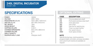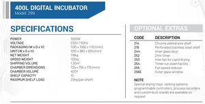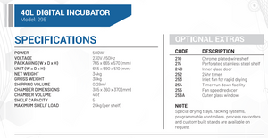 {"id":6075997552799,"title":"Digital Incubators","handle":"digital-incubators","description":"\u003ch3\u003eFeatures\u003c\/h3\u003e\n\u003cul\u003e\n\u003cli\u003eScientific general purpose incubators are ideal for use in fields of life science, pharmacy, clinical science, chemistry and biology \u003c\/li\u003e\n\u003cli\u003eThis unit ensure the highest accuracy essential in critical incubation processes \u003c\/li\u003e\n\u003cli\u003eS\/S 430 body construction with S\/S 304 interior \u003c\/li\u003e\n\u003cli\u003ePowder coated mild steel door and control panel\u003c\/li\u003e\n\u003cli\u003eRobust slam lock door handle\u003c\/li\u003e\n\u003cli\u003eFitted with adjustable hydraulic safety thermostat.\u003c\/li\u003e\n\u003c\/ul\u003e\n\u003cul\u003e\n\u003cli\u003eElectronic P.I.D Temperature control with digital indication of set and process value\u003c\/li\u003e\n\u003cli\u003eHigh accuracy PT 100 temperature sensor \u003c\/li\u003e\n\u003cli\u003eSolid state control relay for optimum reliability and rapid response \u003c\/li\u003e\n\u003cli\u003eDigital display of set and actual temperature to 0.1\u003cspan data-mce-fragment=\"1\"\u003e°C\u003c\/span\u003e\n\u003c\/li\u003e\n\u003cli\u003eOperating temperature +37°C to 110°C based on an ambient of 25°C\u003c\/li\u003e\n\u003cli\u003eTemperature variation across chamber +-1.0C\u003c\/li\u003e\n\u003cli\u003eFitted with adjustable hydraulic safety thermostat\u003c\/li\u003e\n\u003cli\u003eTempreature variation point at +-0.3\u003cspan data-mce-fragment=\"1\"\u003e°C\u003c\/span\u003e\n\u003c\/li\u003e\n\u003c\/ul\u003e\n\u003cp\u003e\u003cspan style=\"text-decoration: underline;\" data-mce-style=\"text-decoration: underline;\"\u003e\u003cstrong\u003eNote:\u003c\/strong\u003e\u003c\/span\u003e\u003c\/p\u003e\n\u003cul\u003e\n\u003cli\u003eTemperature variation figures are based on no load conditions at 100°C\u003c\/li\u003e\n\u003cli\u003eSupplied with 2 chrome plate steel wire shelves\u003c\/li\u003e\n\u003c\/ul\u003e","published_at":"2021-01-10T07:56:01+02:00","created_at":"2021-01-10T07:43:49+02:00","vendor":"Scientlab","type":"Hardware","tags":["Digital Incubators","Incubator","Incubators"],"price":0,"price_min":0,"price_max":0,"available":true,"price_varies":false,"compare_at_price":null,"compare_at_price_min":0,"compare_at_price_max":0,"compare_at_price_varies":false,"variants":[{"id":37517777797279,"title":"40L Digital Incubator","option1":"40L Digital Incubator","option2":null,"option3":null,"sku":"","requires_shipping":true,"taxable":true,"featured_image":{"id":32794257260703,"product_id":6075997552799,"position":7,"created_at":"2022-05-17T15:11:20+02:00","updated_at":"2022-05-17T15:11:20+02:00","alt":null,"width":1000,"height":1000,"src":"\/\/selectech.co.za\/cdn\/shop\/products\/40l-digital-incubator.jpg?v=1652793080","variant_ids":[37517777797279]},"available":true,"name":"Digital Incubators - 40L Digital Incubator","public_title":"40L Digital Incubator","options":["40L Digital Incubator"],"price":0,"weight":0,"compare_at_price":null,"inventory_management":"shopify","barcode":"","featured_media":{"alt":null,"id":25413623840927,"position":7,"preview_image":{"aspect_ratio":1.0,"height":1000,"width":1000,"src":"\/\/selectech.co.za\/cdn\/shop\/products\/40l-digital-incubator.jpg?v=1652793080"}},"requires_selling_plan":false,"selling_plan_allocations":[]},{"id":37517777830047,"title":"80L Digital Incubator","option1":"80L Digital Incubator","option2":null,"option3":null,"sku":"","requires_shipping":true,"taxable":true,"featured_image":{"id":32794258866335,"product_id":6075997552799,"position":8,"created_at":"2022-05-17T15:11:33+02:00","updated_at":"2022-05-17T15:11:33+02:00","alt":null,"width":1000,"height":1000,"src":"\/\/selectech.co.za\/cdn\/shop\/products\/80l-digital-incubator.jpg?v=1652793093","variant_ids":[37517777830047]},"available":true,"name":"Digital Incubators - 80L Digital Incubator","public_title":"80L Digital Incubator","options":["80L Digital Incubator"],"price":0,"weight":0,"compare_at_price":null,"inventory_management":"shopify","barcode":"","featured_media":{"alt":null,"id":25413625479327,"position":8,"preview_image":{"aspect_ratio":1.0,"height":1000,"width":1000,"src":"\/\/selectech.co.za\/cdn\/shop\/products\/80l-digital-incubator.jpg?v=1652793093"}},"requires_selling_plan":false,"selling_plan_allocations":[]},{"id":37517777862815,"title":"160L Digital Incubator","option1":"160L Digital Incubator","option2":null,"option3":null,"sku":"","requires_shipping":true,"taxable":true,"featured_image":{"id":32794259619999,"product_id":6075997552799,"position":9,"created_at":"2022-05-17T15:11:47+02:00","updated_at":"2022-05-17T15:11:47+02:00","alt":null,"width":1000,"height":1000,"src":"\/\/selectech.co.za\/cdn\/shop\/products\/160l-digital-incubator.jpg?v=1652793107","variant_ids":[37517777862815]},"available":true,"name":"Digital Incubators - 160L Digital Incubator","public_title":"160L Digital Incubator","options":["160L Digital Incubator"],"price":0,"weight":0,"compare_at_price":null,"inventory_management":"shopify","barcode":"","featured_media":{"alt":null,"id":25413626200223,"position":9,"preview_image":{"aspect_ratio":1.0,"height":1000,"width":1000,"src":"\/\/selectech.co.za\/cdn\/shop\/products\/160l-digital-incubator.jpg?v=1652793107"}},"requires_selling_plan":false,"selling_plan_allocations":[]},{"id":37517777895583,"title":"240L Digital Incubator","option1":"240L Digital Incubator","option2":null,"option3":null,"sku":"","requires_shipping":true,"taxable":true,"featured_image":{"id":32794260635807,"product_id":6075997552799,"position":10,"created_at":"2022-05-17T15:12:05+02:00","updated_at":"2022-05-17T15:12:05+02:00","alt":null,"width":1000,"height":1000,"src":"\/\/selectech.co.za\/cdn\/shop\/products\/240l-digital-incubator.jpg?v=1652793125","variant_ids":[37517777895583]},"available":true,"name":"Digital Incubators - 240L Digital Incubator","public_title":"240L Digital Incubator","options":["240
